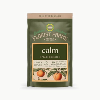 About This Product These vegan gummies are made with real fruit and organic ingredients. If you’re looking for a gummy that actually tastes good, these are a top pick. They are genuinely some of the best gummies we’ve tried. Perfect for when you need to just chill out. Each gummy contains 10mg THC and 10mg CBD. CBD is a natural cannabinoid found in the cannabis plant that helps with reducing stress and anxiety. Dose: 10mg THC + 10mg CBD per gummy (Easy to split in half for a 5mg dose) Quantity: 2 Gummies Flavor: Juicy, refreshing peach Effects: Chill, relaxing, stress-reducing Ingredients: Organic Tapioca Syrup, Sugar, Water, Organic Juice Concentrate, Fruit Pectin, Natural Flavoring, Citric Acid, Sodium Citrate, THC Distillate, CBD Isolate, Organic Sunflower Oil About Florist Farms Located in Cortland, NY, Florist Farms is committed to sustainability. We practice regenerative farming by growing in living soil, using organic compost, and never using pesticides. For over a decade, we’ve been organic vegetable farmers and donate produce weekly to help support our community. At Florist Farms, we’re deeply committed to quality and to delivering the cleanest cannabis products in New York State. Vegan • No Artificial Flavoring or Dyes • No Corn Syrup • Dairy Free • Gluten Free • Soy Free • Tree-Nut Free • Coconut Free