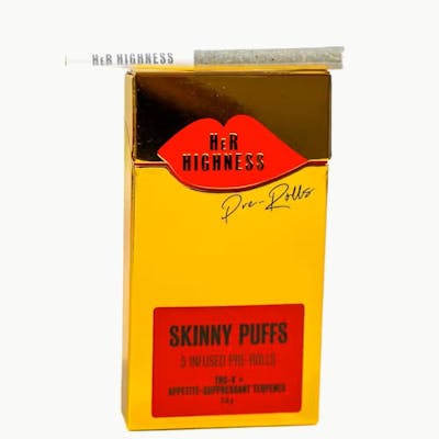 Skinny Puffs are designed for the woman who wants a chic, functional high with appetite control built in. Infused with both THC and THCV, these slim, elegant pre-rolls deliver an uplifting buzz with enhanced focus, energy, and appetite suppression. Perfect for social settings, workdays, or anytime you want to stay high without the munchies, Skinny Puffs are the ultimate lifestyle pre-roll. Each five-pack features Her Highness’ signature feminine cones with elongated crutches, ready to elevate your smoke and diminish cravings.