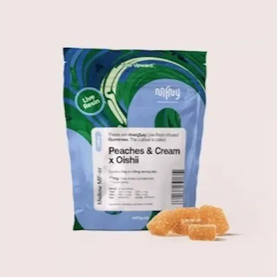 ndulge in smooth flavor and calming effects with MFNY – Peaches & Cream x Oishii Live Resin Gummies, a premium indica edible crafted for terpene-rich taste and consistent potency. Made with live resin, these gummies preserve strain-specific flavor and effects for a more elevated, full-spectrum experience. Each gummy delivers notes of sweet peach, creamy vanilla, and subtle candy fruit, offering a delicious way to unwind. The indica-leaning effects promote deep relaxation, body ease, and a mellow state of mind—perfect for evening use, stress relief, and winding down.