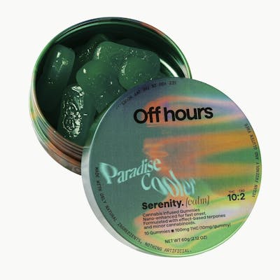 Chill out with Off Hours Paradise Cooler Serenity gummies. Developed with a calming blend of Terpenes, THC, CBD, and CBN, these gummies are the perfect escape.
