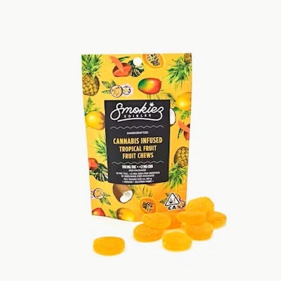 Enhanced with botanical terpenes!Smokiez Sweet Tropical Fruit Chews are NOT YOUR AVERAGE FRUIT CHEWS ;)These fruit chews taste like a mesh of fresh tropical fruits, with a balance of sweetness and fruity notes.These delicious fruit chews are a tasty and discreet way for you to indulge!They are also made with plant-based ingredients, dairy-free, and contain NO high fructose corn syrup.Each of our mouth watering fruit chews contain 10 mg of THC, and made with our high clarity cannabis distillate for great taste.There are 10 pieces per package with 100 mg active THC per package.