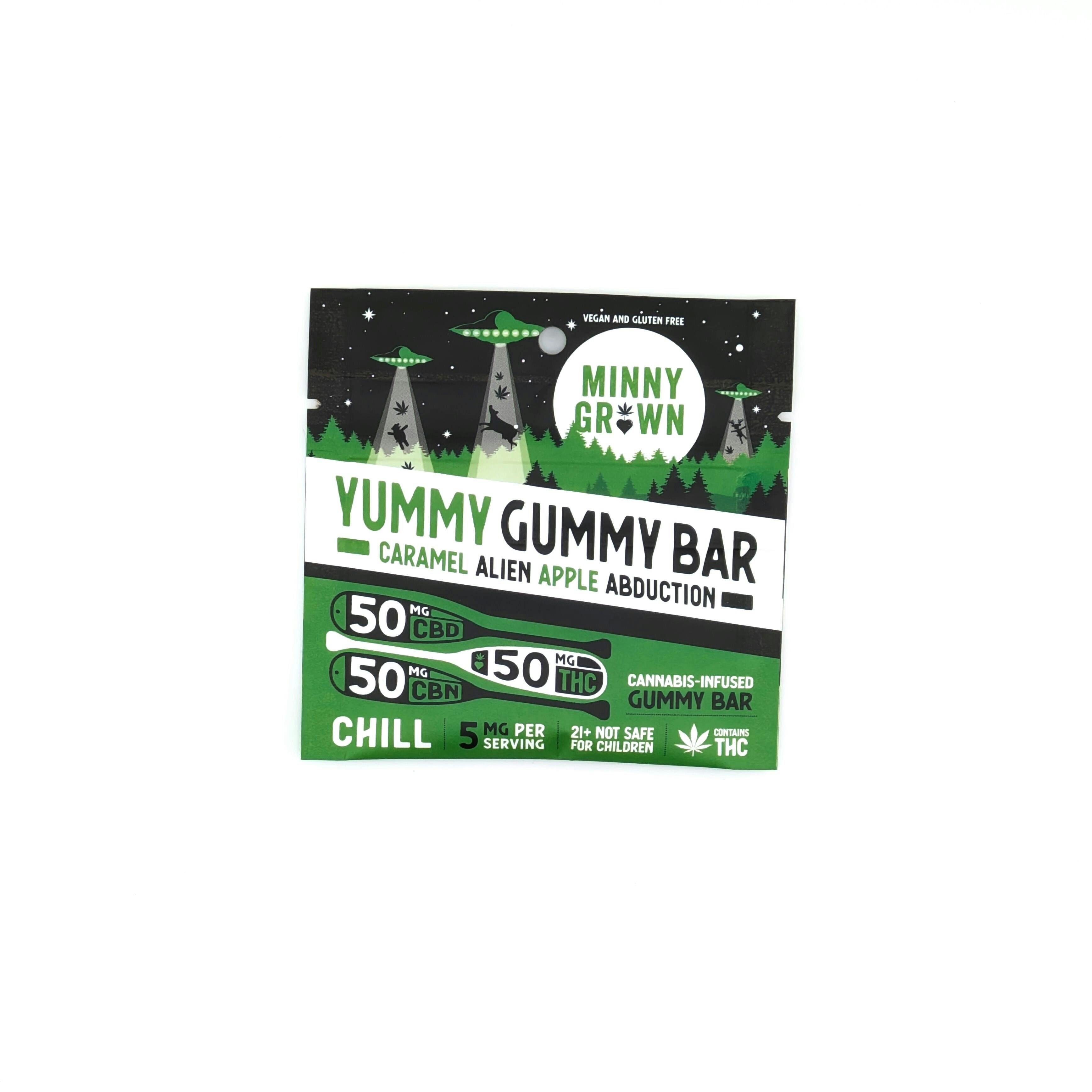 Minny Grown - 50mg THC + 50mg CBD + 50mg CBN Yummy Gummy Bar - Caramel Alien Apple Abduction