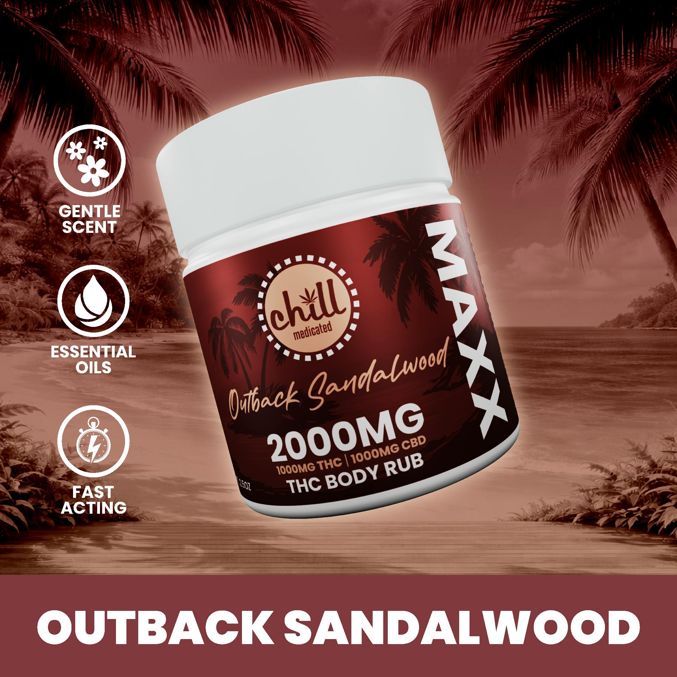 1000mg THC : 1000mg CBD | MAXX Outback Sandalwood Body Rub | REC
