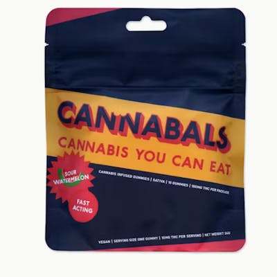 Each package contains 10 gummies, with each piece delivering a potent 10mg of THC. CANNABALS' fast-acting technology ensures you feel the effects quickly, without the long wait typical of traditional edibles. The Sour Watermelon flavor offers a tantalizing blend of tartness and sweetness, creating a mouthwatering sensation that will leave you craving more.
