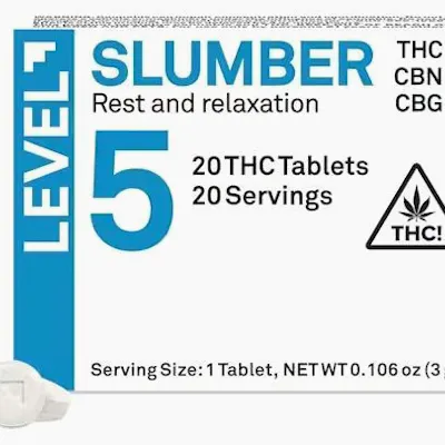 Introducing the Level | Tab Pill | 100mg | Slumber | 20pc/100mg | 1:1:1 | Indica Hybrid by Florist Farms, a meticulously crafted sleep aid designed to enhance your nightly routine with precision and care. Each tablet delivers a balanced 1:1:1 ratio of THC, CBD, and CBN, providing a synergistic effect that promotes relaxation and tranquility while minimizing psychoactive intensity. With a total of 20 tablets, this 100mg formulation is specifically engineered for users seeking relief from insomnia or disrupted sleep patterns. Benefits include not only a restful night's sleep but also a gentle awakening without the grogginess associated with many conventional sleep aids. Experience the therapeutic effects of a premium Indica hybrid, allowing your body and mind to unwind and embrace a deeper, more restorative slumber. With quality you can trust from Florist Farms, elevate your sleep experience to new heights with the Level | Tab Pill.