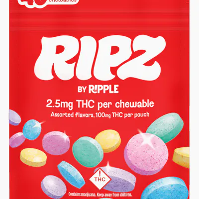 Ripz are candy flavored, chewable tablets made with fast-acting Ripple. With five mouth-watering flavors at 2.5mg THC each, your dose is up to you. Perfect for seasoned users and newbies alike, chew one to take the edge off or chew a handful to transport your senses. Flavors include Blue Razz, Fruit Punch, Lemon, Berry, and Cherry Limeade. - Just as with all Ripple products, Ripz are proven fast-acting and highly bioavailable. Always discreet, convenient, and consistent. - Fast-acting | Gluten-free | Vegan - Hybrid - THC: 100mg 2.5mg THC per chewable 40 chewables per container