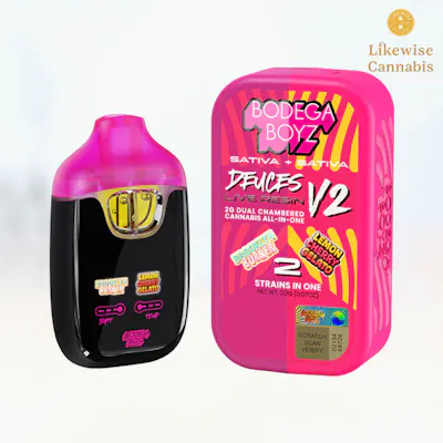 Sativa - Brooklyn Burner Sativa - Lemon Cherry Gelato Experience the ultimate in innovation with Deuces, our dynamic dual-chamber filled with Live Resin Sativa goodness. On one side, savor the invigorating citrus explosion of Lemon OG, while on the other, indulge in the mysterious blend of exotic flavors in Pink Guava. Operate Deuces effortlessly with three lights - Red, Blue, and Red/Blue - signifying each flavor. Tap once to switch between flavors, or double-tap to enjoy a fusion of both. Perfect for those seeking uplifting sativa vibes, Deuces lets you customize your journey and double down on flavor and fun. Why settle for two flavors when you can have three? Description sourced from Bodega Boyz *Please add to cart all products for any deals that you would like or add order notes for specifics. If nothing added, we will default to filling the order as placed. All deals, discounts & incentives will be taken care of on our end automatically, just add what you want to your cart and we'll always get you the best deal available. Online orders held for 24H maximum.*
