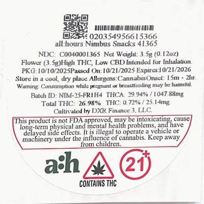 all:hours Nimbus Snacks 41365- 26.98% THC NDC: C0040001365 Sativa all:hours Flower (3.5g) Nimbus Snacks (Durban Mints x GSC)