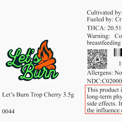 Meet Trop Cherry — a sativa-dominant hybrid (60/40) bred from Tropicana Cookies × Cherry Cookies F3 and crafted in small batches by Let's Burn. This cut hits with bright tangerine and zesty citrus up front, layered over sweet cherry and ripe tropical fruit on the exhale. Daytime-ready and full of flavor, Trop Cherry is built for those who want their smoke loud, fruity, and dialed in from the first pull.