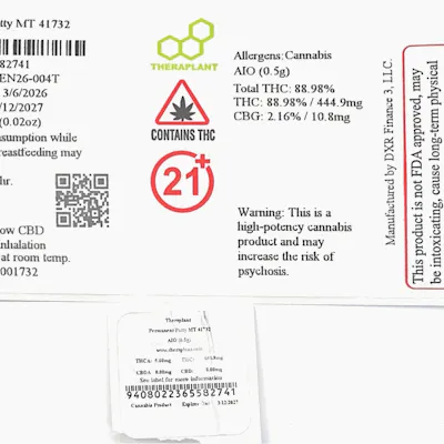 Permanent Patty MT 41732 - 88.98% THC / 1.47% Terps NDC:C0040001732 Hybrid AIO (0.5g) 10pk Permanent Patty (Permanent Marker x Hash Burger) FLW EQ: 1.78g EXP: 3/12/2027