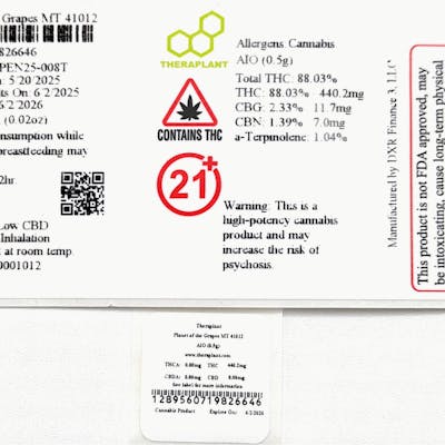 Planet of the Grapes MT 41012- 88.03% THC NDC: C0040001012 Indica AIO (0.5g) Grape Diamonds X ChemD x I-95 FLW EQ: 1.76g EXP: 06/02/2026