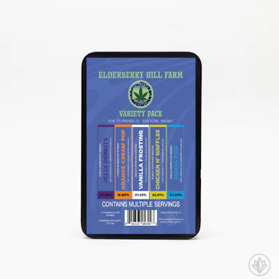 Includes: Chicken N' Waffles 25.91% THC Indica Dom. Hybrid Jelly Donuts 24.98% THC Sativa Dom. Hybrid Moon Fog 24.23% THC Indica Dom. Hybrid Orange Cream Pop 19.80% THC Sativa Dom. Hybrid Vanilla Frosting 27.32% THC Sativa Dom. Hybrid