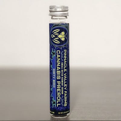 Get ready to soar with Dirty Bird, an Indica-leaning hybrid crafted from the legendary lineage of Falcon 9 and Scotty 2 Hotty. This 1 Gram Premium Pre-Roll delivers a flavorful and potent experience, expertly rolled for a smooth, consistent burn. What Makes It Special: Strain: Dirty Bird (Falcon 9 x Scotty 2 Hotty) Breeder: Exotic Genetix Profile: Indica-leaning hybrid with bold flavors and balanced effects for mind and body. Aroma and Flavor Profile: Aroma: A nostalgic nod to old-school skunk, blended with sour citrus, candy sweetness, and gassy undertones. Flavor: Zesty orange spice with layers of fuel and subtle sweetness. Effects: Euphoria: A burst of mental uplift sets the tone for creativity or socializing. Relaxation: Potent physical effects ease tension, leaving you deeply relaxed. Happiness: A round of giggles and carefree joy to brighten your mood. Crafted for Perfection: Our Dirty Bird Pre-Roll is made with care using 1 gram of premium, hand-selected flower for a rich and potent smoke. Whether you're unwinding after a long day or enhancing your favorite activities, Dirty Bird is your perfect companion. Experience bold flavor, deeply satisfying effects, and nostalgic aromas with Pinnacle Valley Farms’ Dirty Bird Pre-Roll, designed to elevate your senses and soothe your soul.