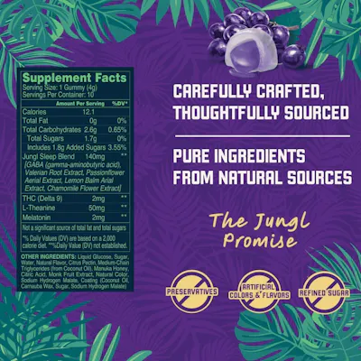 Gentle. Juicy. Just right for sleep. Drift off without the groggy aftershock. JUNGL’s Grape Sleep Gummies are infused with a low dose of THC (2mg), a blend of CBD+CBG+CBN, and a premium herbal sleep blend, including, chamomile, L-theanine, melatonin, and calming botanical extracts. They’re clean, vegan, and naturally flavored with real grape for a satisfying nightcap that’s effective without overpowering. Designed for those who want to unwind without high THC intensity, these sleep weed gummies bring relaxation and rest into perfect balance.