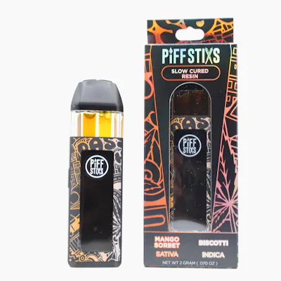 Piff Stixs Mango Sorbet / Biscotti 2g Disposable features two distinct strains in one sleek device, allowing you to enjoy each side individually. Made with slow cured resin, this formula preserves bold terpene flavor and delivers a smooth, true-to-plant vapor experience. Mango Sorbet offers juicy tropical sweetness with bright, uplifting sativa-leaning effects, while Biscotti brings rich, dessert-like notes of earth and spice paired with relaxing indica vibes. Switch between an energizing daytime boost and a calming evening unwind in one convenient, long-lasting 2-gram disposable.