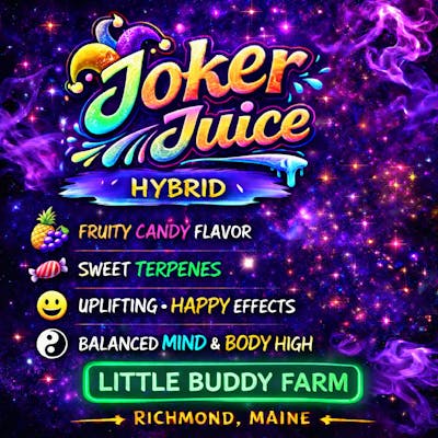 Joker Juice – Fruity Candy Hybrid cannabis flower is available at Little Buddy Farm in Richmond Maine, known for its sweet candy flavor, smooth smoke, and balanced hybrid effects. Customers searching for fruity cannabis strains in Maine often gravitate toward Joker Juice for its uplifting mood and relaxing body balance.