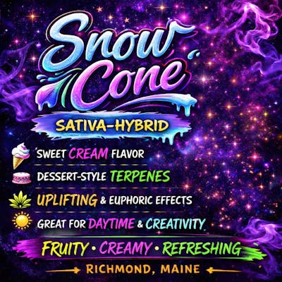 ο»ΏSnow Cone β Sweet Cream Sativa Hybrid cannabis flower is available at Little Buddy Farm in Richmond Maine, known for its creamy vanilla terpene profile, frosty trichomes, and uplifting euphoric effects. Customers searching for Snow Cone strain in Maine often choose this cultivar for its dessert-style flavor and energizing hybrid experience.