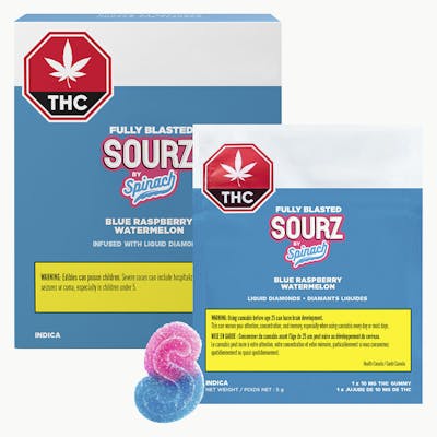 [1GUMMY - THC=10mg] Prepare for blast off! SOURZ by Spinach® Fully Blasted Blue Raspberry Watermelon gummies are packed with 10mg THC per piece. With out-of-this-world flavours like electric blue raspberry and fresh watermelon, send your taste buds soaring! These dual-flavoured gummies are over-the-top with natural flavours and blasted with sour crystals. Enjoy 10 gummies with 10mg THC per gummy and 100mg THC total per pack. [INGREDIENTS: Sugar (Sugar, TapiocaSyrup), Water, Erythritol, NaturalFlavours, Pectin, Gluconic Acid, MalicAcid, Tartaric Acid, Sodium PotassiumTartrate, Citric Acid, Modified CoconutOil and/or Modified Palm Oil and/orModified Rapeseed Oil (Medium ChainTriglycerides), Sodium Citrate,Cannabis Extract, Sodium Phosphate,FD&C red no. 3, FD&C blue no. 1]