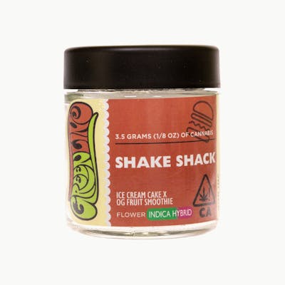 Shake Shack is an evenly balanced hybrid strain (50% indica/50% sativa) created through crossing the potent Ice Cream Cake X Fruit Smoothie OG strains. Named for the iconic fast-food chain, Shake Shack is the perfect delicious treat to help settle both mind and body, not matter how crazy your day or week has been. The flavor of Shake Shack is like your go-to fruity milkshake, with a blend of creamy, sugary red fruits topped with whipped vanilla and a hint of sweet dank. The aroma is a bit heavier, bringing in added layers of pungency and a touch of diesel that has you feeling like you're sitting at a gas station.