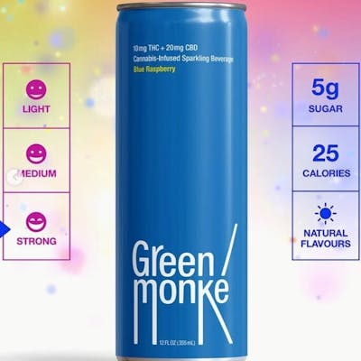 A new Green Monké flavour with nostalgic blue raspberry flavour mixed with a bit of tart lemonade. With a 2:1 ratio of CBD to THC, this drink contains 20 mg of CBD and 10 mg of THC. Now made in a totally recyclable printed can. Pour this blue sparkling liquid into a frosty mug full of ice. Made without gluten or animal products.