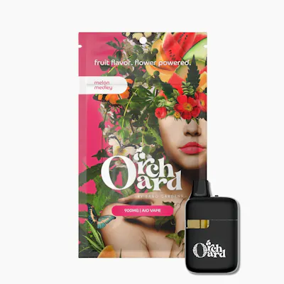 A refreshing blend of ripe melon flavors designed for smooth, everyday enjoyment. Bright, juicy, and easygoing. Powered by a CCELL Tank All-In-One device, this 900mg disposable delivers consistent vapor. Like sinking your teeth into a ripe melon on a hot day, Melon Medley tastes sweet with strong melon and floral notes. Not just another flavored vape, Orchard delivers 100% natural plant-derived flavors combined with high potency THC and terpenes.