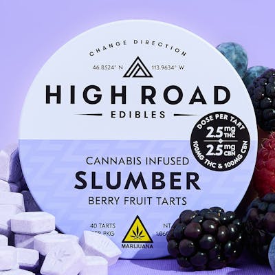 New from High Road! Slumber – Made with Indica Cannabis and an Equal Ratio of THC + CBN Intended to help you sleep restfully 100mg THC per package (40 individual servings of 2.5mg THC + 2.5mg CBN) Made with full spectrum cannabis extract Vegan and gluten free
