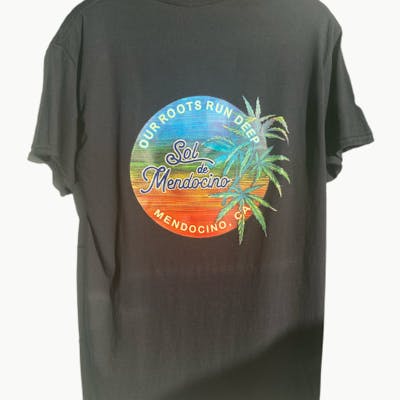 Sol de Mendocino cotton t-shirt with full color 7 screen logo on back. Men's Classic T or Women's Deep V. Locally made by Hidden Treasures T-Shirt Company in Fort Bragg.