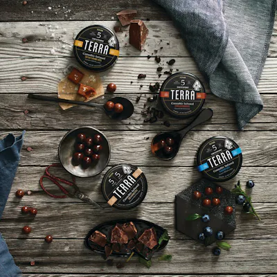 KIVA Terra Bites are crafted from micro-roasted Tanzanian coffee beans and coated in Kiva Dark Chocolate. With 5MG of THC per bite, Terra offers dosing that is as convenient as it is delicious. The reclosable container makes it easy to enjoy a little now, and with 100mg THC in each tin, a little later, too. All Natural Ingredients: Semisweet Chocolate (Sugar, Unsweetened Chocolate, Cocoa Butter, Potassium Carbonate, Lecithin (Sunflower and/or Soya), Vanilla), Espresso Bean, Cannabis Extract, Confectioner's Glaze, Cocoa Powder, Natural Flavor. Blueberry Terra Bites: Using a traditional 24-hour panning process, dried US-grown blueberries are dusted with cocoa powder and finished with a generous coating of delicious milk chocolate. Each 5MG bite is polished to sweet, tart, irresistible, perfection. Ingredients: Milk Chocolate (Sugar, Cocoa Butter, Milk, Unsweetened Chocolate, Lecithin (Sunflower and/or Soya), Vanilla), Cultivated Blueberry (Sugar, Blueberry, Sunflower Oil), Confectioner's Glaze, Cannabis Extract, Cocoa Powder, Natural Flavor, Citric Acid. Dark Chocolate Almond 1:1 Bites: CBD Almond Terra boasts a rich, crunchy, sweet and salty taste you are sure to crave- with a balanced formula you’re guaranteed to adore. Each delectable dark chocolate bite is handcrafted with 5MG of THC and 5MG of CBD to bring you back to alignment in the most delicious way possible. Ingredients: Semisweet Chocolate (Sugar, Unsweetened Chocolate, Cocoa Butter, Potassium Carbonate, Sunflower Lecithin, Vanilla), Dry Roasted Almonds, Cannabis Extract, Sea Salt, Cocoa Powder, Gum Arabic, Natural Flavor WONF, Confectioner's Glaze, Sucrose, Glucose Syrup. Dark Chocolate Espresso Bean Bites: Espresso Terra Bites are crafted from micro-roasted Tanzanian coffee beans coated in premium dark chocolate. Each bite is polished to rich, earthy, irresistible perfection. Our espresso beans are sourced from Bay Area, California favorite Andytown Coffee Roasters. Ingredients: Semisweet Chocolate (Sugar, Unsweetened Chocolate, Cocoa Butter, Potassium Carbonate, Sunflower Lecithin, Vanilla), Espresso Bean, Gum Arabic, Cannabis Extract, Cocoa Powder, Confectioner's Glaze, Natural Flavor, Sucrose, Glucose Syrup. Sea Salt Milk Chocolate Caramel Bites: Sea Salt Caramel Terra Bites boast delicious, rich, and smooth caramel centers coated in creamy, hash-infused milk chocolate and sprinkled with Pacific sea salt. These bites have a sweet, buttery flavor that finishes with a salty kick. Ingredients: Milk Chocolate (Sugar, Cocoa Butter, Milk, Cocoa Mass, Sunflower Lecithin, Vanilla), Tapioca Syrup, Sugar, Cream (Milk), Palm Kernel Oil, Sea Salt, Gum Arabic, Cannabis Extract, Natural Flavors, Confectioner's Glaze, Sucrose, Glucose Syrup.