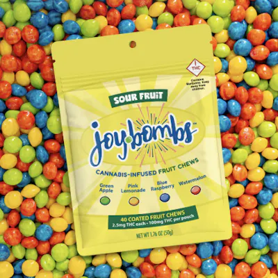 Satisfy your sweet (& sour!) tooth with Sour Fruit Joy Bombs Candy-Coated Fruit Chews! Includes an explosive mix of tart, tangy, mouth-watering flavors: Green Apple, Pink Lemonade, Blue Raspberry & Watermelon! Joy Bombs’ signature sugary shell means they'll melt in your mind, but not in your car, purse, or pocket. They're perfect for easy snacking and sharing. Joy Bombs are purposefully dosed to help you dial in or stack the milligrams and effects that you want! With 2.5mg THC in each bite-sized piece, you can micro-dose for days or nom the whole pouch for a 100mg adventure! Dietary Info: Gluten Free & Vegan. Processed in a facility that also processes soy.