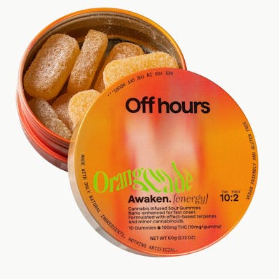 FLAVOR: Orange Punch (Sour) TERPENES: SPECIAL BLEND FOR ENERGY SIZE: 10CT STRENGTH: 100mg THC (10MG/Serving) + 20MG THCV (2MG/Serving) Ready to wake up? Off Hours Awaken Orange Punch gummies are specially formulated with an eye-opening blend of terpenes, THC and THCV to energize your day. SUGGESTED USE: Start with 1/2 of a gummy. Wait 1 full hour before increasing dose. INGREDIENTS: Organic Cane Sugar, Reverse Osmosis Water, Organic Tapioca Syrup, Organic Fruit Juice From Concentrate, Fruit Pectin, Organic Fruit Flavoring, Natural Food Coloring, MCT Oil, Cannabis Extract, Soy Extract, Terpenes, Malic Acid