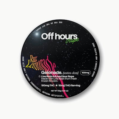 Off Hours turns up the tang with their Gelonade Sour Rope, a live resin–infused edible bursting with citrusy brightness and hybrid energy. Made from a zesty cross of Lemon Tree and Gelato 41, this sativa-leaning rope delivers 100mg of THC across ten 10mg segments—each one a sour raspberry lemonade flavor bomb. Expect an uplifting, chatty, and creative high with just enough grounding to keep you mellow and present. INGREDIENTS: Organic cane sugar, reverse osmosis water, organic tapioca syrup, organic fruit juice from concentrate, fruit pectin, organic fruit flavoring, natural food coloring, MCT oil, cannabis extract, soy extract, terpenes, malic acid