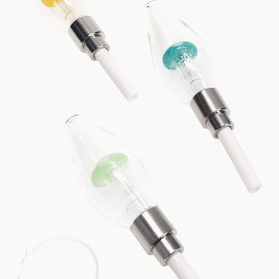 Dab Straw Clear glass bulb dab straw with unique mushroom percolator and screw-on ceramic tip. Includes glass wax tray. Colors will vary. Approximate size (without tip): 3.5" Approximate size (with tip): 5" Approximate weight: 50g