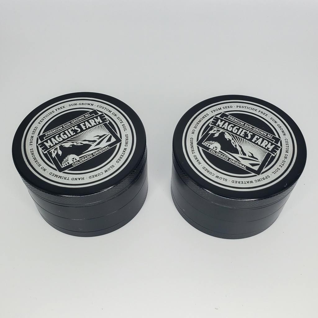 4-piece aluminum 63mm grinder with Maggie's logo.