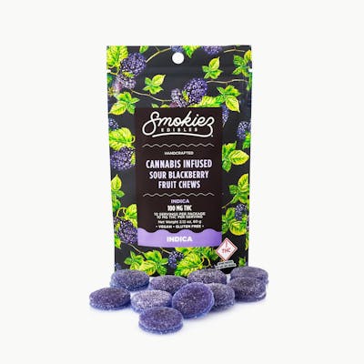 Smokiez Edibles Sour Blackberry Indica 100mg THC Fruit Chews Smokiez Fruit Chews are NOT YOUR AVERAGE GUMMIES™ These delicious Fruit Chews are a tasty and satisfying way for your customers to medicate! They are also Vegan, Gluten Free, Dairy-Free, and contain NO High Fructose Corn Syrup. Each of our mouth watering Fruit Chews contain 10 mg of THC, and made with our high clarity cannabis distillate for great taste. There are 10 pieces per package with 100 mg active THC per package.