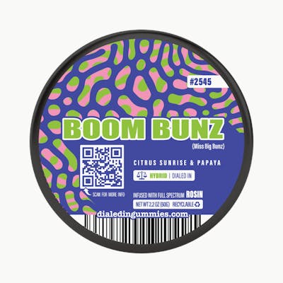 Boom Bunz is bright, bouncy, and built to keep things moving. Grown by Bonsai and powered by the lively Miss Big Bunz lineage, this hybrid hits with an upbeat citrus pop and a tropical twist that feels equal parts refreshing and smooth. Citrus Sunrise (Mimosa) and Papaya gummies bring juicy, sun-soaked flavor that sets the tone before the effects even kick in. The vibe lands right in that sweet spot—mentally lifted, socially charged, and physically at ease. Great for daytime hangs, creative sessions, or anytime you want to stay engaged without going overboard. Boom Bunz keeps your energy buoyant and your mood light, like a perfectly timed beat drop that carries you through the moment. Balanced, flavorful, and fully Dialed In.