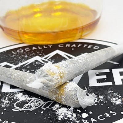 Our Live Infused Pre-roll is loaded with premium flower/trim, kief, and diamond dust on the inside and then we paint a strip of Live Terpenes and then roll it in Diamond Dust. The Diamond Dust is our 99% THCA diamonds crushed into a powder and sprinkled on the inside and dusted on the outside. They are testing over 30%