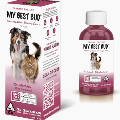 OMD Flex combines targeted cannabinoids with plant-derived terpenes to support mobility, flexibility, and joint comfort. Ideal for pets who benefit from daily movement support as part of an active or aging lifestyle. Effective January 1, 2026, California regulations allow the marketing of oral products formulated for animals that contain less than 1 mg of THC. My Best Bud is the only brand built from the ground up to meet these requirements, with patented formulations specifically engineered to support common pet wellness needs—guided by science and real-world data. PATENTED • TESTED • TRUSTED My Best Bud holds multiple patents covering formulations, methods of use, and our proprietary OMD™ (OroMucosal Delivery) system, designed for consistent absorption and quick onset—without the variability of traditional ingestion. NO GUESSWORK — QR-GUIDED SELECTION Each product features a QR code that connects your customers to our Right Ratio Guide and dosage calculator, helping them confidently choose the optimal formulation and personalize use by species, weight, and product type.