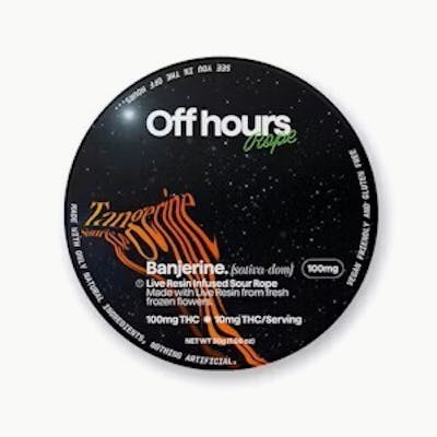 Off Hours sour Tangerine Sunrise ropes are infused with Banjerine Live Resin for an energizing, social high. Each rope is naturally flavored with yuzu, tangerine, and a splash of pineapple to complement citrusy Bangerine.
