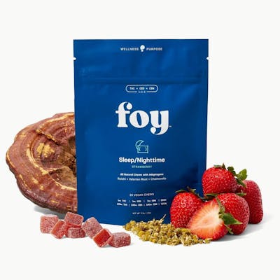 Elevate your nightly routine with a healthier alternative that surpasses the standard gummy. Foy Nighttime vegan chews are consciously formulated with authentic non-GMO fruit purées, delicately coated in powder derived from natural strawberries, and enriched with a potent adaptogen blend of USDA Certified Organic Reishi mushroom, USDA Certified Organic Valerian Root, and USDA Certified Organic Chamomile. These CO2-extracted, CBN-enriched chews are specially designed to promote optimal sleep quality and help reestablish a harmonious, restful sleep pattern. With 5mg of THC, 5mg of CBD, and 5mg of CBN per chew, Foy Nighttime Chews offer an unparalleled 300mg of total cannabinoids, elevating your nighttime routine to bring you the gift of rejuvenating slumber. EFFECTS: Feel calm, relaxed, and ready for restful sleep and recovery without morning grogginess. A gentle wave of comfort eases your mind and body, helping you fall asleep faster, stay asleep longer, and wake up refreshed. Experience the Benefits: THC: Each Foy chew is crafted with premium CO2 extracted cannabis oil. CBD: Naturally relieves stress. CBN: Naturally improves sleep quality and reestablishes a healthy sleep pattern. USDA Organic Chamomile: Naturally promotes relaxation. USDA Organic Reishi Mushroom: Naturally reduces inflammation. USDA Organic Valerian Root: Naturally aids in recovery, and achieving a deeper, more restful sleep. *Vegan, *USDA Certified Organic Ingredients, *Gluten-Free, *Made with Premium CO2 Extracted Cannabis Oil, *No Artificial Dyes or Flavors, *Responsible Packaging, *300mg of Total Cannabinoids
