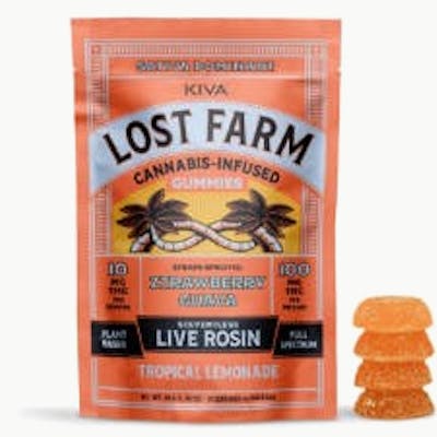 Lost Farm's Tropical Lemonade x Ztrawberry Guava gummies are a sativa-dominant product that combines a sweet and tart citrus flavor with a juicy strawberry and exotic guava taste. They are made with 100% live solventless rosin for a full-spectrum experience and are designed to promote an uplifting high with effects like happiness, focus, creativity, and gentle energy. The gummies are suitable for daytime enjoyment, creative projects, or social moments.