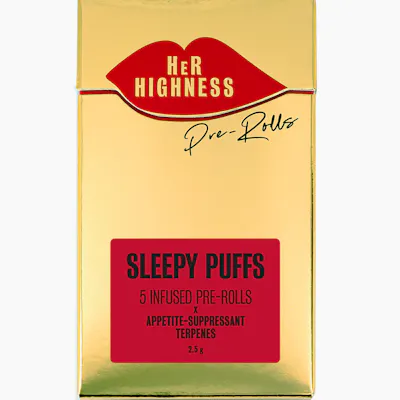 Sleepy Puffs provide a serene, dreamy high. Perfect for ending the day with a big smile and deliciously sedated body high. Infused with distillate and appetite-suppressant terpenes high in Humulene, they're low-munchies. Premium Velvet Vampire is indica dominant, a cross between Red Velvet Cake and London Pound Cake; it works to calm the mind instantly. Her Highness ultra feminine pre-rolls are slim, elegant and beautiful to smoke, featuring an extra long crutch to protect nails and lashes. (5) .5g cones are presented in our signature CR gold cigarette box.