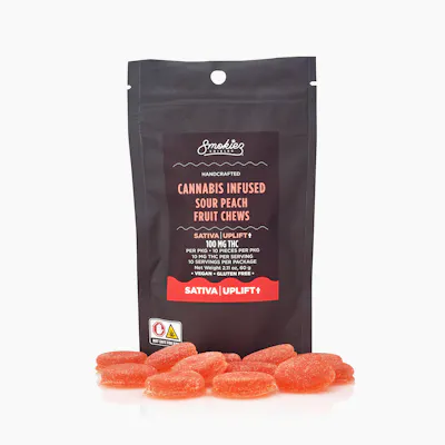 Enhanced with real cannabis terpenes! Smokiez Sour Peach Sativa Fruit Chews are NOT YOUR AVERAGE FRUIT CHEWS™ ;) These fruit chews taste like fresh peaches picked right off the tree, with a tangy balance of fruity and citrusy notes. These delicious fruit chews are a tasty and discreet way for you to medicate! They are also Vegan, Gluten Free, Dairy-Free, and contain NO High Fructose Corn Syrup. Each of our mouth watering fruit chews contain 10 mg of THC, and made with our high clarity cannabis distillate for great taste. There are 10 pieces per package with 100 mg active THC per package.