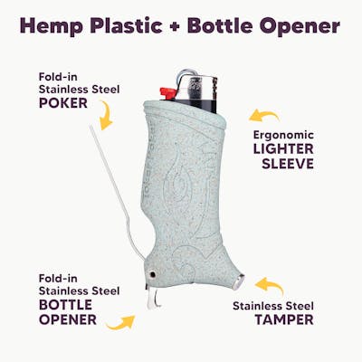 Toker Poker, Hemp Plastic + Bottle Opener. We took things up a notch with this all-inclusive Bic Lighter® Sleeve. Sustainability meets functionality. Our Hemp Plastic model is made from the hemp plant itself, sourced from Detroit Michigan! As a bonus, we added a flip out Bottle Opener to pair with the stainless steel Tamper and Poker. Now you have all the tools you need to enjoy your bowl and a brew, all in your lighter sleeve. - Toker Poker