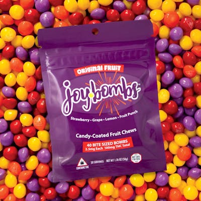 Savor a classic candy experience with Original Fruit Joy Bombs Candy-Coated Fruit Chews! Includes an explosive mix of delicious fruit flavors: Strawberry, Lemon, Grape & Fruit Punch! Joy Bombs’ signature sugary shell means they'll melt in your mind, but not in your car, purse, or pocket. They're perfect for easy snacking and sharing. Joy Bombs are purposefully dosed to help you dial in or stack the milligrams and effects that you want! With 2.5mg THC in each bite-sized piece, you can micro-dose for days or nom the whole pouch for a 100mg adventure! Dietary Info: Gluten Free & Vegan. Contains Soy.