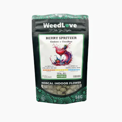 Berry Spritzer from WeedLove is bubbly, bold, and ready to pop! This indoor-grown hybrid, crafted from Guzherz x Chauffeur, serves up frosty buds with a juicy aroma of mixed berries, sweet candy, and a splash of citrus zest. Flavor stays lively with notes of ripe fruit, light cream, and a fizzy, gassy finish that keeps things interesting. The effects feel balanced and social, delivering a bright, heady buzz alongside a smooth, easy body vibe. Fun flavor, solid potency, and everyday-friendly value - WeedLove to take you higher.