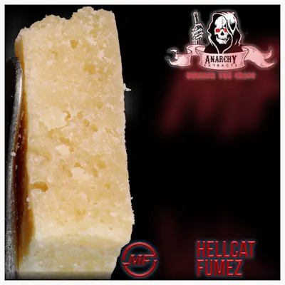 Hellcat Fumez is a potent, terpene-rich hybrid strain, often found in concentrate forms like crumble or budder (e.g., Anarchy Extracts), characterized by a bold, gassy, and sweet citrus flavor profile. It is known for a high-terpene, euphoric, and uplifting effect that gradually settles into a relaxed, calming body high, ideal for both daytime and evening use.
