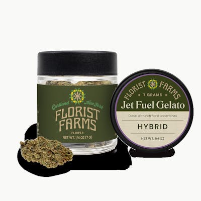 Fuel up with Jet Fuel Gelato, a dank hybrid created by Compound Genetics from Jet Fuel and Gelato. The pungent aroma fills the room with diesel and sweet ice cream notes, while flavors deliver creamy berry with hints of pepper and gas on the exhale. Renowned for a balanced, focused, and productive high, it's perfect for daytime creativity or afternoon energy. Regeneratively grown in Cortland, NY. Ready for takeoff! Florist Farms is an organic farm that practices regenerative farming practices based in Cortland, New York. It’s Florist Farms' commitment to making the finest, carefully crafted products free of pesticides, chemicals, and fillers. All from right here in New York. Florist Farms is all about letting cannabis be cannabis—pure, simple, and unaltered. Their commitment to sustainability and transparency sets them apart, making their products a favorite for people who love weed.