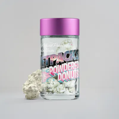 Settle in with Jetpacks Powdered Donuts Midtown Kush — frosted flower dusted in THCa diamonds for heavyweight indica bliss. True to its Kush heritage, this cultivar brings a rich, earthy aroma layered with pine, spice, and hints of citrusy fuel. The flavor lands smooth with woody, peppery notes and a warm, kushy finish. Expect a calming wave of euphoria that melts into full-body relaxation and couch-worthy comfort. Ideal for winding down evenings or easing into a restful night. Grab an eighth and let Midtown Kush tuck you in! Jetpacks Powdered Donuts - Interstellar potency. Diamond precision. Powdered Donuts starts with premium greenhouse whole flower—no stems, no trim—then coats it in high-potency THCa crushed diamonds for a consistently powerful, flavor-packed experience. Available in 3.5g jars. Jetpacks Takes You Places. Launched in 2020 by Falcon Brands, this California-born rocket ship has become one of New York's top-selling cannabis brands. Their signature infused pre-rolls combine strain-specific flower with kief and a proprietary shatter infusion, pushing potency past 30% THC. The lineup spans kief-dusted pre-rolls, diamond-encrusted Big Bang joints, Powdered Donuts diamond-infused flower, and a full concentrate menu of badder, sugar, live resin, and diamonds. Premium potency, bold flavor, glow-in-the-dark packaging—no boarding pass required!