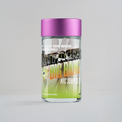 NYC Sour Diesel hits like the city that made it—loud, fast, unforgettable. Born in the '90s underground from Chemdawg x Super Skunk, this iconic sativa delivers pungent diesel fuel, sour lemon, and earthy skunk driven by caryophyllene, limonene, and myrcene. Live resin and crushed THCa diamonds supercharge the cerebral rush—pure focus, creativity, and electric energy with zero couch-lock. Fuel up your morning or power through any afternoon! Jetpacks Big Bang Series - Otherworldly potency. Hand-inspected precision. Big Bang starts with whole flower—no stems, no trim—infused with live resin, then encrusted in crushed THCa diamonds. Every pre-roll is built for liftoff. Available in 0.5g, 1g, 2g, and 2.5g 5-packs. Jetpacks Takes You Places. Launched in 2020 by Falcon Brands, this California-born rocket ship has become one of New York's top-selling cannabis brands. Their signature infused pre-rolls combine strain-specific flower with kief and a proprietary shatter infusion, pushing potency past 30% THC. The lineup spans kief-dusted pre-rolls, diamond-encrusted Big Bang joints, Powdered Donuts diamond-infused flower, and a full concentrate menu of badder, sugar, live resin, and diamonds. Premium potency, bold flavor, glow-in-the-dark packaging—no boarding pass required!