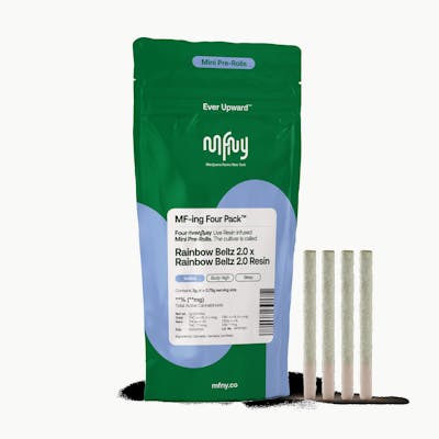 Rainbow Beltz 2.0 from Archive Seed Bank crosses Zkittlez with Moonbow, and MFNY doubles down by infusing premium flower with matching live resin HTFSE. This single-source powerhouse delivers tantalizing fruity aromas and sweet candy undertones in every puff. Caryophyllene and limonene terpenes promote calming euphoria that relaxes body and mind. Four hand-trimmed joints offer high-potency bliss for experienced consumers. No shake, no trim—just Hudson Valley craft. Unwrap the rainbow! MFNY represents the authentic spirit of New York cannabis, cultivating premium products at their single-source farm in the Hudson Valley. Their MF-ing difference is their seed-to-shelf approach, controlling every variable from cultivation to processing to ensure exceptional quality. Unlike many cultivators, MFNY grows exclusively for their own brand—never distracted by producing for others. They respect the plant's natural qualities, using concentrated live rosin and live resin in all non-flower products rather than dissatisfying distillate. Every decision MFNY makes serves to elevate New York's new state flower, creating cannabis experiences worthy of the Empire State's diverse and discerning people.